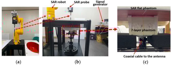 SAR measurement setup with DASY 5 SAR robot: (a) SAR robot with the probe, (b) whole measurement setup, and (c) antenna placement.