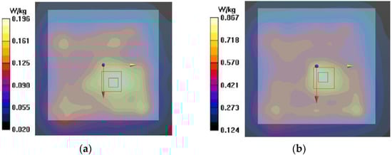 It is required to examine the specific absorption rate (SAR)—the amount of non-ionizing radiated power absorbed by the surrounding biological tissues—for an implantable wireless device. SAR standards differ by countries or regulatory agencies; however, two SAR standards are mainly considered: IEEE C95.1-1999 [29] and IEEE C95.1-2005 [30]. The maximum allowable SAR values are 1.6 W/kg averaged over 1 g of tissue and 2 W/kg over 10 g of tissue for IEEE C95.1-1999 and IEEE C95.1-2005, respectively.