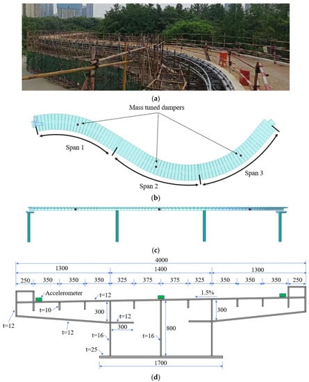 Pedestrian bridges play important roles in improving mobility through diverging pedestrians and vehicles, improving pedestrian safety, and mitigating congestion, particularly in major cities. With the shrinkage of available spaces in the course of urbanization, curved pedestrian bridges attract intensive interest because of their adaptability to the landscape constraints and aesthetic advantages in urban infrastructure []. The span lengths of curved pedestrian bridges keep increasing, and thin cross-sections have been adopted in many curved bridges. The adoption of thin cross-sections makes curved bridges aesthetically appealing. However, the use of thin sections led to low flexural and torsional stiffness as well as low natural frequencies of the bridges []. The fundamental frequencies of many pedestrian bridges are lower than 3 Hz [], which are comparable with the frequency of pedestrian excitation. Pedestrian loads may cause resonance of the bridges and lead to catastrophic consequences such as collapse []. The vibration of bridges compromises their serviceability and durability [].