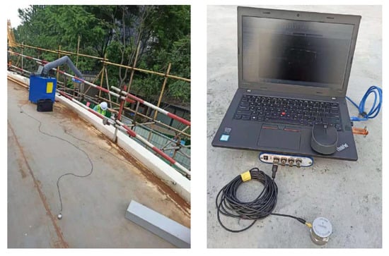 The three spans of the bridge were respectively tested after the bridge was erected and instrumented with accelerometers. Nine accelerometers were deployed in the bridge that had three spans. In each span, three accelerometers were deployed at the mid-span section, as depicted in Figure 1d. Along the transverse (width) direction of the bridge, the three accelerometers were attached to the bridge deck in the center and at the two sides of the mid-span section, as shown in Figure 2.