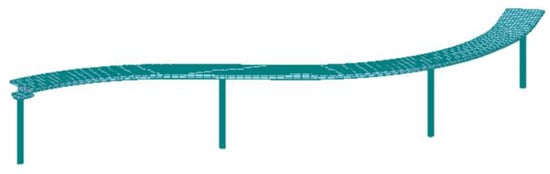 A three-dimensional finite element model was established for further analysis of the bridge using a commercial software MIDAS CIVIL, which is a well-developed software used to analyze the static and dynamic responses of bridges, as elaborated in references [,]. The curved steel box girder was simulated using three-dimensional two-node beam elements. The cross-sections of the beam elements were consistent with the steel box girder of the real bridge. The cap girders and piers were also simulated using beam elements, and the cross-sections of the beam elements were consistent with the geometry of the real bridge. A total of 372 beam elements were created.