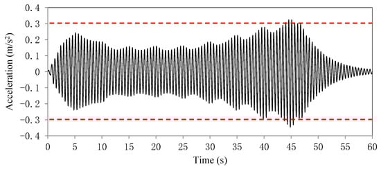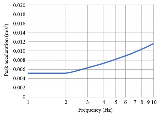 The serviceability of the bridge was evaluated according to the ISO specifications [,,]. The threshold of accelerations was limited at each frequency, as shown in Figure 4. The accelerations of pedestrian bridges should be equal to or lower than the threshold. The ISO specifications were applied to both the vertical and transverse directions of the bridge.