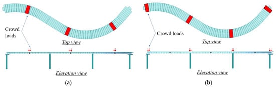 Depiction of the two load cases of in-situ tests of the bridge instrumented with three mass tuned dampers: (a) Case I and (b) Case II. A red area represents 10 adults, with an average weight of 750 n per person and distributed at 0.6 of a person per m2.