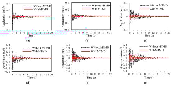 With the determined design parameters, the lateral accelerations at the five cross-sections of the bridge were analyzed using the finite element model incorporating the MTMD, as listed in Table 6. At all the five sections, the minimum lateral acceleration was achieved when the total mass ratio was 0.02, which was selected as the total mass ratio for further research.