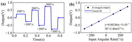 Figure 3a shows the simulation results for the angular rate directly output in RIG mode by a vibrating amplitude control method, where the input angular rates are ±100°/s, ±200°/s, and ±300°/s. The simulation parameters are listed in Table 1. Figure 3b shows that the average output is proportional to the input angular rate and that the scale factor is approximately 2.46 mV/°/s. The simulation and the measurement results prove the correctness of (13) and provide a basis for improving the switching stability.