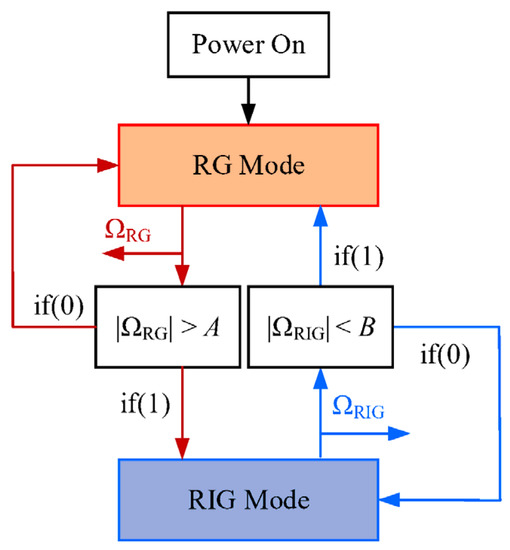 To ensure that mode switching is carried out reliably and automatically, we choose different preset rate points for the two operational modes, where A and B are the preset RG-to-RIG and RIG-to-RG thresholds, respectively. ΩRG and ΩRIG are the rate outputs of RG and RIG modes, respectively, as shown in Figure 4. We can set switching thresholds as required for the condition A > B, as the system can misjudge or make repeated switches when A ≤ B, resulting in unstable or failed switches. The switch module consists of three functions for automatic comparison, switching, and precession angle tracking (Figure 4). The gyro operates in RG mode when powered on and switches to RIG mode with open-loop angle control when the output satisfies . In RIG mode, the system tracks the precession angle information in real time. When is satisfied, the information stops refreshing, and it is used as the reference value for the closed-loop angle control to switch back to RG mode.
