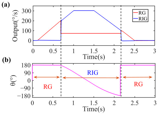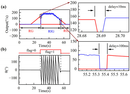 Figure 10a also shows that the control system switches between RG and RIG modes successfully and automatically. The rate output of the RIG (blue lines) still has an angle-dependent bias error during rotation due to residual asymmetric errors as clearly demonstrated in (5) and (11). However, in this paper, the gyro only operates in RIG mode at high rates, so the angle-dependent bias has less impact on the performance of the RIG in this situation.