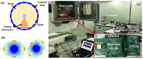 (a) Structure and (b) mode shapes of the n = 2 wineglass modes of the CDRG. (c) Test platform and control circuit. The control circuit includes the interface circuit to extract gyro signals, an ADC, and a DAC for the conversion of digital and analog signals and an FPGA to realize the control program.