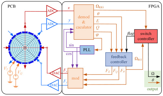 Block diagram of mode switching control system. The ‘demod & calculator’ module in the FPGA is used to demodulate and calculate the required control signals; the PLL module is used to track the resonant frequency of the gyro; the switch controller module is used to compare the angular rate and the preset rate and send the switching control flag; and the feedback controller and ‘mod’ modules are used to generate and to modulate the feedback signals to the gyro.