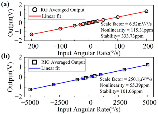 Scale factor tests were carried out on a rate table at room temperature. The gyro outputs were measured under rotation rates of ±0.1°/s, ±1°/s, ±5°/s, ±10°/s, ±15°/s, ±20°/s, ±30°/s, ±50°/s, ±100°/s, ±200°/s in RG mode and ±200°/s, ±300°/s, ±500°/s, ±1000°/s, ±3000°/s, ±5000°/s in RIG mode. Figure 8a,b shows the scale factor fitting curves in RG and RIG modes, respectively. The measured value is 6.52 mV/°/s in RG mode and 250.1 μV/°/s in RIG mode. The scale factor nonlinearity of the RG and RIG modes in their measurement ranges reaches approximately 116 ppm and 56 ppm, respectively, and the scale factor stability is 334 ppm and 102 ppm, respectively. The RIG operation mode achieves better scale factor performance at larger rates.