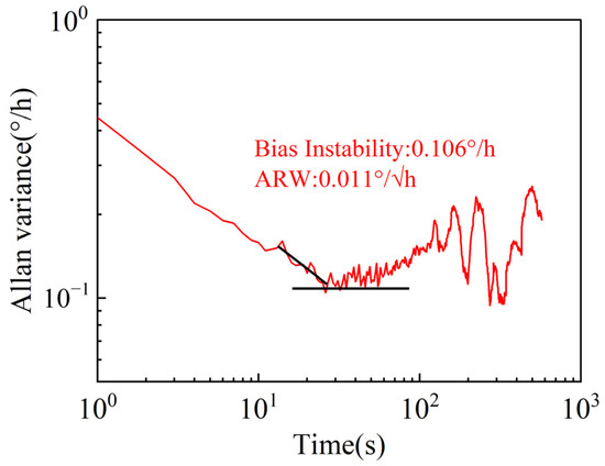 After the open-loop mode-matching operation, zero-rate output (ZRO) data from the FPGA were collected through the serial port at room temperature over an acquisition time of more than 30 min and a sampling frequency of 1 Hz. Figure 9 shows the Allan variance curve of the ZRO data. The figure shows that the bias instability (BI) and angle random walk (ARW) are 0.106°/h and 0.011°/√h, respectively.