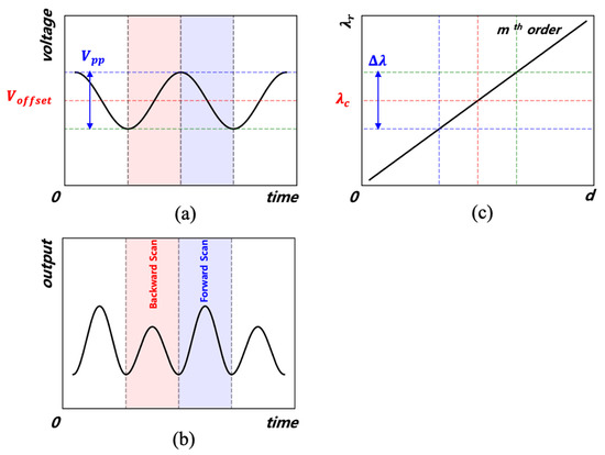 where d is the distance between the Fabry–Pérot mirrors. When a voltage is applied to the piezoelectric transducer (PZT) inside the FFP-TF, the interval d is changed, and thus the transmitted wavelength is changed. When a constant voltage is applied to the PZT, interval d is fixed; thus, only a specific wavelength is transmitted. Conversely, when a sinusoidal voltage is applied, the interval d changes periodically and thus can be used as a wavelength scanning filter as the transmitted wavelength changes over a specific period. In FFP-TF-based WSLs, when a sinusoidal voltage is applied to the FFP-TF, forward and backward wavelength scans are performed according to the respective voltage variation [,,,,,,,,,,]. Here, a forward scan is defined as scanning from a short wavelength to a long wavelength, and a backward scan is the opposite case. Figure 1 shows the change in resonance wavelength λr according to the applied FFP-TF voltage and the WSL output. As shown in Figure 1a, when a sinusoidal voltage is applied, the resonance wavelength of the m-th order shifts with a range of Δλ centered on the wavelength λc, as shown in Figure 1c, where λc is the peak wavelength of WSL. The WSL output is shown in Figure 1b; when the voltage applied decreases, the interval d increases, and λr becomes a longer wavelength. Therefore, the WSL scans twice within one voltage period. However, the interval d is affected by both the applied FFP-TF voltage and temperature changes due to the external temperature and heat generated by the applied PZT voltage. Even when a constant voltage is applied to the FFP-TF, the transmitted wavelength varies because of this thermal instability. In general, the output spectrum of WSL is dominated by the gain for each wavelength of SOA. When the area scanned by FFP-TF passes the SOA gain spectrum band, the output of the WSL depending on the SOA gain has one peak per half period of the applied frequency. Although FFP-TF is affected by internal or external thermal perturbation, the peak position of the WSL spectrum maximized is always the same as the wavelength with the largest gain of SOA.