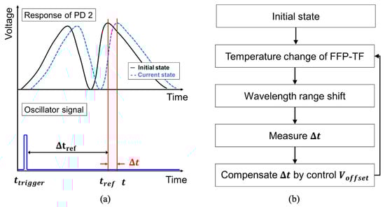 Figure 2 shows a schematic of the algorithm based on closed-loop control of the WSL output via the peak position of the forward or backward scan []. As shown in Figure 2a, the peak position tref of the WSL waveform initial state in the temporal domain was measured based on the oscillator trigger signal. The peak wavelength position was shifted to point t by altering the external and internal temperatures of the FFP-TF. The time difference Δt = t − tref caused by the change in the peak position was measured. By adjusting the offset voltage for this change, a feedback voltage was applied to the FFP-TF to correct to close to zero. By repeating this process, as shown in the flowchart in Figure 2b, the peak wavelength was stabilized to tref. In general, other factors such as temperature changes of the laser diode (LD) and oscillator can also change the peak point tref. However, the LD temperature change is stabilized by the temperature controller, and does not change because tref and ttrigger change simultaneously with the temperature change in the oscillator, as shown in Figure 2a.