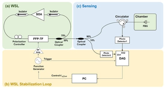 A wavelength-swept laser (WSL) varies its wavelength rapidly and continuously across a wide wavelength range and a narrow linewidth [,,,,]. It has been mainly used as a light source for optical coherence tomography (OCT) in biophotonics and for dynamic optical fiber sensors because it has a wide scanning range, fast scanning frequency, and narrow linewidth. Lab-built WSLs offer greater flexibility than commercial ones. For example, even if the optical system is a little more complex, it has the advantage of being able to configure it for a desired purpose at a low price []. The WSL comprises a filter that continuously changes the wavelength, the gain medium, and the feedback element. Semiconductor optical amplifiers (SOA) or rare-earth-doped optical fibers are mainly used as gain media. A wide gain medium allows operation over a wide scanning range. Recently, a WSL with a scanning range of 150 nm or higher using two SOAs has been reported [,,,,]. A wavelength-tunable filter generally uses a polygonal scanning wavelength tunable filter (PSWTF) [,,,,] or a fiber Fabry–Pérot tunable filter (FFP-TF) [,,,,,,,,]. Recently, electro-optic and acousto-optic tunable filters have also been reported [,,]; among these, the FFP-TF and PSWTF are the most commonly used wavelength filters. There are advantages and disadvantages to choosing each filter type for the WSL. Although PSWTFs have difficulty in precise optical alignment in free space, they have a linear one-to-one correspondence between the time and wavelength domains, thus requiring less complex signal processing. Conversely, FFP-TFs have thermal instability, but since a WSL can be implemented with all-optical fibers, difficult optical alignment is not required [,,,,,]. Using a high-speed tunable filter, the WSL can operate at a speed of tens of kHz or higher [,,,]. FFP-TFs can be implemented at a scanning frequency of tens of kHz or more using the Fourier domain mode locking (FDML) method [,,,,,,]. However, the time and wavelength domains correspond nonlinearly for WSLs based on FFP-TF because the voltage applied to the filter is a sinusoidal function. Therefore, additional signal processing is required, and the oscillation wavelength is not well maintained due to the FFP-TF thermal instability. When measuring wavelength change in dynamic optical fiber sensors using a WSL, if the WSL output wavelength varies due to thermal instability, the sensor sensitivity is affected [,,,,]. In particular, monitoring one wavelength component of the WSL in the temporal domain may reveal a thermally induced drift due to this instability. Therefore, when using an FFP-TF-based WSL light source with thermal drift in a sensor that measures wavelength change, wavelength stabilization is required. Measuring the signal reflected from the fiber Bragg grating (FBG) in the temporal domain makes it difficult to distinguish whether it is a signal from the sensor or a signal due to thermal drift. To improve the accuracy and sensitivity of WSL-based sensors, it is necessary to thermally stabilize the WSL by removing the thermal instability of the filter [,,,]. Recently, a method for stabilizing the peak wavelength of a light source in an FBG-based optical fiber sensor has been reported. J. Sung, et al. have proposed a method of stabilizing a self-synchronization scheme of a WSL-based FBG sensor []. Here, they reported the results of improving the sensing performance in the temporal domain with a self-synchronization scheme by applying multiple sensing processing units (SPUs). Commercially stabilized FFP-TF-based WSL creates an error signal to compensate for the thermal instability of the filter, measures it with photodetector (PD), and controls only a specific wavelength in a closed-loop manner [].