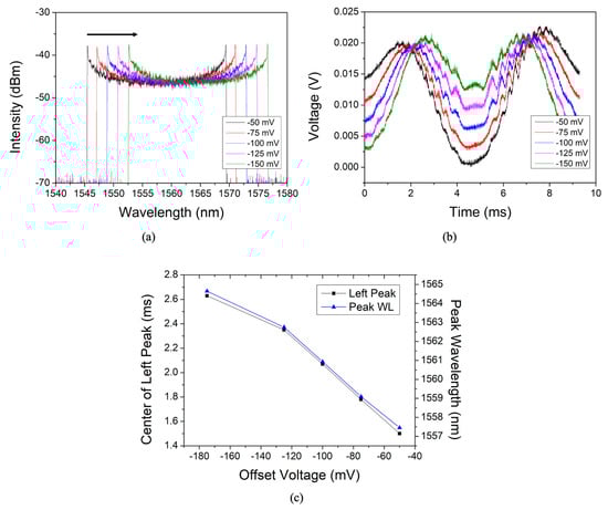 Figure 4a,b show the output results of the WSL measured in the spectral and temporal domains, respectively, according to the Voffset applied to the FFP-TF. Figure 4a shows that the measured spectral bandwidth in the spectral domain was shifted to the longer wavelength with respect to Voffset. As previously stated, the WSL has a linear one-to-one correspondence between the spectral and temporal domains [,,,,]. Figure 4b shows that in the corresponding temporal domain, the distance between the two peaks of the forward and backward scans decreases, and the central overlapping portion between the two scans increases. The peaks of the forward scan (left) shift to the right in the temporal domain and overlap each other. This is a phenomenon that occurs as the wavelength band of WSL moves to a longer wavelength. When this overlap between scans increases, the wavelength component at the overlapping portion cannot be accurately measured. Figure 4c shows the variation of the center wavelength of WSL output in the spectral domain (right axis) and the variation of the forward scan peak in the temporal domain (left axis) with respect to Voffset. The variation of the central wavelength and the peak position show almost the same trend.