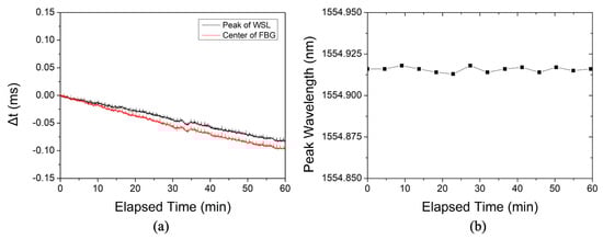 Figure 5 shows the variation of peak position of the reflected signal from the FBG when the WSL stabilization loop is not applied (i.e., temperature compensation is not applied). Figure 5a shows the variation in the peak positions of the WSL output and FBG reflection signals in the temporal domain for 1 h. The drift Δt confirmed a change of −0.10 ms when measured for 1 h. This does not mean a maximum wavelength drift, and depending on the external environment, a larger Δt may occur or a smaller Δt may occur. The position of the reflected signal peak from the FBG changes similarly to the peak wavelength position for the WSL output. Figure 5b shows the result of measuring the variation in the peak wavelength reflected from the FBG in the spectral domain for 1 h. As predicted, it can be seen that the peak wavelength reflected from the FBG in the wavelength domain is kept constant, but there is a drift in the FBG reflection peak in the time domain.