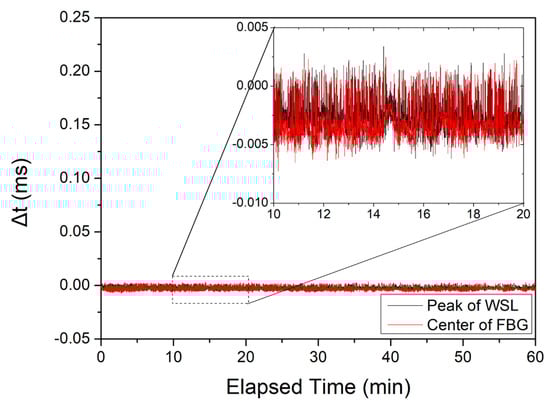 Range of peak position, Δt of WSL (red line) and FBG (black line) in the temporal domain when a WSL stabilization closed-loop control system is applied.