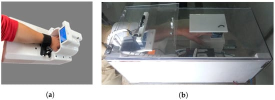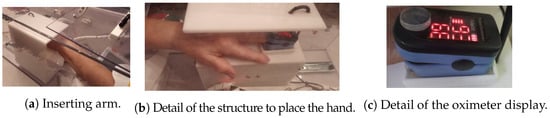 Figure 2. Details of the experiments with the IPMA. In (a), an individual inserting his/her arm; in (b), the detail of the structure where the hand is placed to measure body temperature and oxygen saturation; in (c), a photo of the oximeter display. The upper number (right in the image) is the oxygen saturation, and the bottom number (left in the image) is the heart rate. There is a silicone cover on the power button to avoid the linear actuator damaging the oximeter.