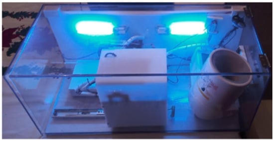 The IPMA used in this study is shown in Figure 1, in two different versions (see the details of these two versions in Table 1 and Figure 2). Inside the IPMA, there is an oximeter, an automatic blood pressure device, a thermometer, and a microphone. These sensors are responsible for acquiring the oxygen saturation levels (SpO2), Heart Rate (HR), Blood Pressure (BP), Body Temperature (T), and cough from the volunteer. Data from the blood pressure device were not used in this study. After every use, the IPMA was completely sterilized, for 2.5 min, using UV-C lamps (see the moment of that sterilization for version B in Figure 3; version A must be put inside a box with UV-C radiation to be sterilized). It is worth mentioning that there was no contact of the volunteer with the UV-C light, which can be harmful to the eyes and skin. In version B, the structure is made of transparent polycarbonate, which blocks the UV-C spectrum. For safety, the UV-C lamps are turned on only if the IPMA’s door is closed, and there is a limit-switch and a control relay that cuts the energy immediately if the IPMA’s door is open, turning off the UV-C lamps.