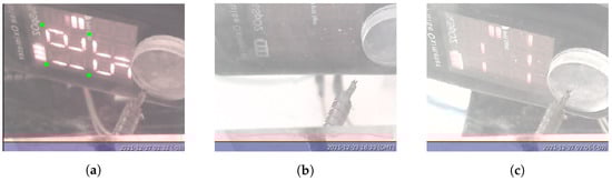 Figure 4. Possible states of the oximeter display. (a) Complete reading procedure and points (in green) needed for the oximeter image alignment; (b) oximeter turned off; (c) incomplete reading procedure.