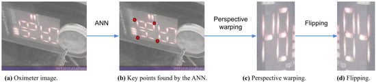 Tensorflow lite was used to convert the model into a 32 bit version, allowing the IPMA to be embedded on a Raspberry board. Then, it was used to find the key points in the images. A perspective transformation was performed to align and segment the SpO2 reading, and finally, a vertical flip was applied. The full procedure of the image alignment applied to the oximeter is presented in Figure 6.