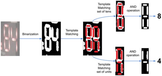Once the images are aligned by using VGG16, the OCR algorithm takes the images and binarises them, and a template matching algorithm is used to locate the segments of the 7-segment digits in the image. This is performed in two parts, first finding the position of the full number, then performing the template matching on each digit. Afterwards, the algorithm checks if the segment is activated or not and then compares it with a 7-segment display table, thus determining which digit, from 0 to 9, is being displayed. This algorithm has been demonstrated to be a 100% efficient. Thus, once the digits are recognized, it is possible to know the respective number shown in the display, knowing the position of each digit. Figure 7 shows the diagram of the OCR recognition system.