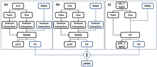 In our research, we used cough and audio sounds (from the CCS and CSS of the Cambridge COVID-19 Sound database [22]), in addition to the data of body temperature, heart rate, and SpO2 from [17], to train our machine learning algorithms (Quadratic kernel-free non-linear Support Vector Machine (QSVM) and Decision Tree (DT) with Gini’s diversity index to split the data), and then, we applied them to the data collected by the IPMA. Figure 8 shows the block diagram for these algorithms.