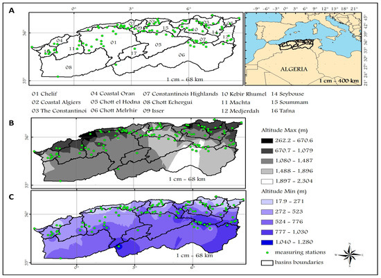 Figure 1. Maps of the northern Algeria region (A) and elevation variation (B,C) of 16 watersheds, showing the hydrometric stations’ locations.