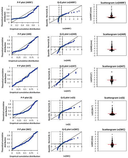 Figure 2. P–P plot, Q–Q plot, and scattergram graph of the dataset series, used in this modeling. Inter-annual rainfall-runoff residual (IARR’), inter-annual rainfall (IAR), inter-annual temperature (IAT), watershed area (S), and watercourse (WC).