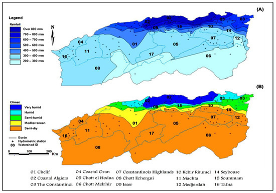 According to the bioclimatic classification given by [45], northern Algeria has a climatic diversity spread over five floors, from very humid to very dry (Figure 3B). The figure shows that watershed 02, which is located in the northern part and overlooking the Mediterranean Sea has a very humid climate, characterized by IAR values varying between 700 mm and >800 mm (Figure 3A). On the other hand, watersheds 09, 15, and 10 have the greatest climatic diversity, varying between very humid, humid, semi-humid, Mediterranean, and semi-dry. Where in this area, the rainfall varies between 400 mm and >800 mm. This diversity depends mainly on the geographical and geological characteristics of the region. In the northeastern part, watershed 03 is characterized by a very humid, humid, and semi-humid climate, where the IAR varies between 500 mm and >800 mm. The catchment area 01, 14, and 12 have a climatic diversity which is between humid, semi-humid, Mediterranean, and semi-dry. In this area, the minimum rainfall was observed in watershed 14, which arrives at 300 mm. Differently, in watersheds 01 and 12, the minimum rainfall values reach up to 200 mm in the southern areas.