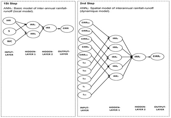 Figure 4. Proposed ANNs model architecture, used to estimate residuals computational of the Ol’Dekop model. The local and basic model (ANN1), general and dynamic model (ANN2). Inter-annual rainfall (IAR), watershed area (S), watercourse (WC), De Martonne index (I), Semi-Dry (SD), Mediterranean (ME), Semi-Humid (SH), Humid (H), and Very Humid (VH).