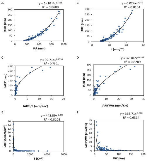 Figure 5. Nonlinear regression curve between inter-annual rainfall-runoff residuals data obtained by Ol’Dekop’s model (IARR’) and ANNS input variables which are (A) Inter-annual rainfall (IAR); (B) De martone index (I); (C,E) watershed area (S); (D,F) watercourse (WC).