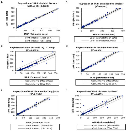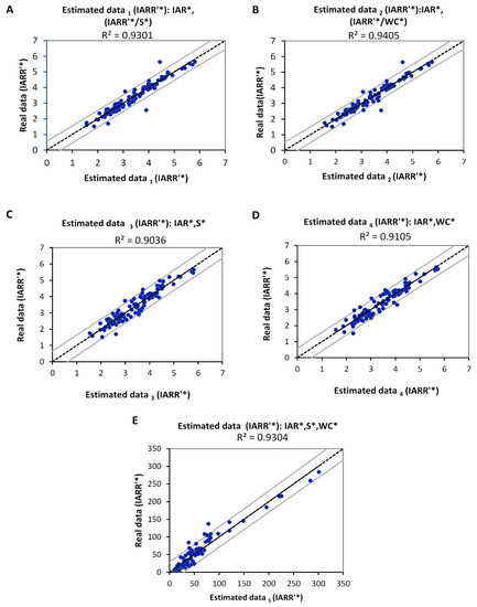 On the other hand, the figure also shows a good nonlinear regression between IARR’ and   IARR S , and also between IARR’ and IARR Wc according to R2 results, which equal 0.7501 and 0.8209, respectively, given by Figure 5C,D. The regression relationship between both input variables are defined by Equations (14) and (15), respectively: