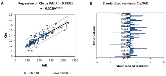 The graphs shown in Figure 5A,B prove some trends of values, which are shown in the range of the maximum value. Regression models cited above are defined by Equations (12) and (13):