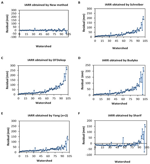 On the other hand, Sharif’s model shows good results compared to Schreiber, Ol’dekop, and Budyko, where the mean residuals obtained by this last one are symmetrical, distributed between negative and positive value ranges for the axis (X = 0). In this study, the Ol’Dekop model shows a very big tendency for residual data compared to other models, reaching up to 300 mm. In addition, Schreiber and Budyko produce a significant trend of data compared to real observations in watersheds, ranked from 61 to 102, which are located in semi-humid, humid, and hyper-humid climate regions (Figure 3). Table 7 shows that the IARR data series, which is obtained by the proposed model has a similar variability to the real data, given by a coefficient of variation, which equals 9292.465 and 9797.2623, respectively. Moreover, the mean values of both series are 81.4977 and 81.1249, respectively.