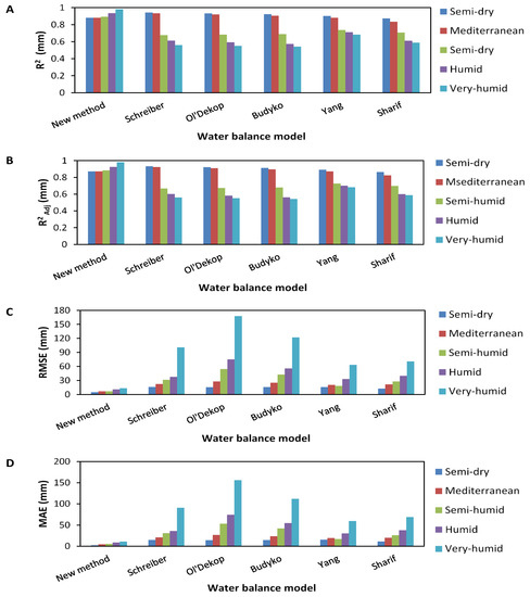 Figure 10. Histograms explaining performance analysis of the new model against a set of parametric (Yang, and Sharif) and non-parametric (Schreiber, Ol’Dekop, and Budyko) water balance models on five climatic regions of Northern Algeria. These were shown by (A) determination coefficient (R2); (B) adjusted coefficient of determination (R2Adj); (C) root mean square error (RMSE); (D) mean absolute error (MAE).