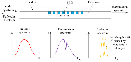 The structure and principle of FBG are shown in Figure 1. The principle is that when the broadband light source passes through the grating as the incident light, the light wave with the same phase as the grating is reflected, and the other light waves are transmitted from the FBG. The measured physical quantity can be obtained through the light wave reflection theory [25].