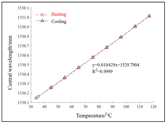 Here, the change in is Bragg wavelength, and and are thermal expansion and thermo-optic coefficients, respectively. In the normal temperature area, °C−1. Compared with the coefficient of thermal expansion, the contribution of the thermo-optic effect to the wavelength change is 95%. For fiber gratings with a central wavelength of 1300 nm, a temperature change of 1 °C leads to a wavelength of 9.13 pm.