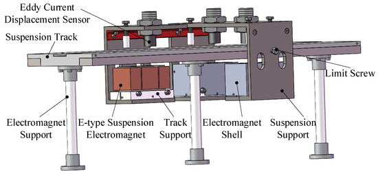At present, the MSSS can be divided into electromagnetic suspension (EMS) and electrodynamic suspension (EDS) according to the suspension principle. The levitation principle of Maglev bearing studied in this paper is EMS. Through the real-time measurement of the distance between the train and the track and by adjusting the current in the electromagnet, the controllable electromagnetic force is generated to make the train levitate stably. Figure 3 is the structure diagram of the simple experimental device of magnetic suspension support, which mainly includes E-type suspension electromagnet, electromagnet support, track support, electromagnet shell, suspension support, suspension track, limit screw and eddy current displacement sensor.