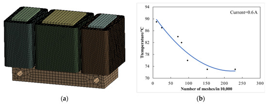 The thermal analysis module of ANSYS Workbench software is used to analyze the temperature field of electromagnet, the main component of magnetic suspension support. Firstly, the thermal analysis module and Maxwell 2D module are coupled with each other, and various losses calculated by electromagnetic calculation in Maxwell 2D are extracted as thermal loads for solution. The data between the two modules can be exchanged and updated with each other so that more accurate results can be obtained; the coupling framework of magnetic thermal analysis is shown in Figure 6. Then, select the meshing element, set the number of meshes and mesh the electromagnet finite element analysis model. The results are shown in Figure 7. The accuracy of finite element analysis is affected by the number of meshes, but at a certain number of grids, the simulation results does not change with the change of the number of meshes, so it is necessary to verify the independence of meshes. When the number of meshes is less than , the temperature simulation result is not accurate, while when it is greater than , the temperature result is stable and will not be affected by the number of grids.