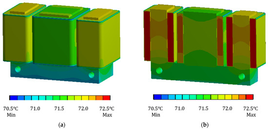 It can be seen from Figure 8 that the temperature difference between the electromagnet core and the coil winding is not very large, and the heating at the coil winding is the most serious, with a maximum temperature of 72.1 °C. Because the temperature inside the coil winding is not easy to disperse, the maximum temperature is inside the coil winding. From the cutaway temperature distribution cloud diagram, it can also be seen that the temperature inside the coil winding is higher than that on the outer surface. When considering copper loss and iron loss at the same time, analyze the temperature field of the electromagnet. The current of coil winding is still taken as . Load the copper loss heat generation rate and iron loss heat generation rate into the finite element model, set the ambient temperature to 30 °C, solve the finite element model and obtain the simulation results of temperature field of electromagnet under this condition, as shown in Figure 9.