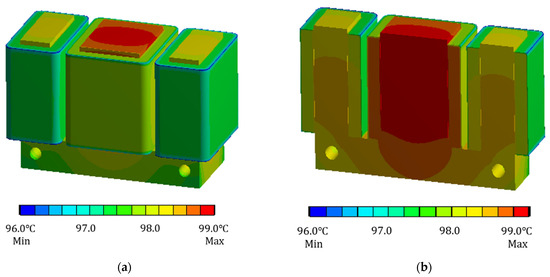 Cloud diagram of steady-state temperature field distribution of electromagnet considering copper loss and iron loss at the same time. (a) Overall diagram. (b) Cutaway diagram.