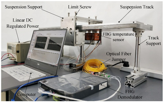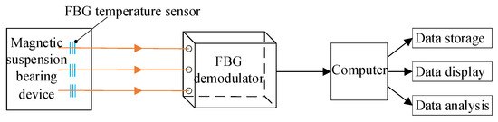 Magnetic suspension support technology uses electromagnetic force to realize the contactless suspension of the suspended body. Compared with the traditional mechanical support technology and air suspension support technology, it has many advantages and is widely used in magnetic suspension trains, magnetic suspension bearing and magnetic suspension vibration isolation devices [1,2]. However, with the increase in the operation energy consumption of the magnetic suspension support system (MSSS), the temperature of the system rises. The temperature rise mainly has the following effects on the MSSS: (1) It affects the reliability of the system. When the system temperature exceeds its allowable temperature, it leads to the aging of insulating materials and reduce its service life; (2) When the system temperature is too high, the temperature drift of the sensor affects the accuracy of displacement detection, which further affects the dynamic performance of the whole system. It can be seen that the temperature rise is an important factor limiting the development of suspension support technology. At present, there are many methods of temperature measurement. Thermocouple and thermal resistance are common “point” contact temperature measurement technology. Through this method, the temperature values of multiple positions of the measured object can be obtained. When using this temperature measurement technology to measure the temperature of multiple positions, the monitoring system will have too many wires, which is complicated, and the temperature measurement technology is vulnerable to electromagnetic interference and poor stability. The point thermometer also belongs to the contact temperature measurement technology. When measuring the temperature, it must contact the surface of the measured object. Its measurement accuracy is affected by the roughness of the measured surface and the perpendicularity between the probe and the measured surface, and the accuracy is low; an infrared thermal imager is a typical non-contact temperature measurement technology, which has the advantages of non-contact, fast and high-temperature resolution. However, an infrared thermal imager can only measure the surface temperature field that can be photographed; compared with these temperature measurement technologies, fiber Bragg grating (FBG) temperature sensor has the advantages of small volume, good stability, high measurement accuracy, electromagnetic interference immunity and “one-line and multi-point” distributed online monitoring.