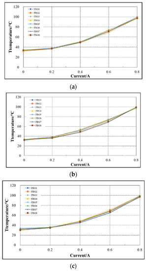 As can be seen from Figure 16a–c, under the same current, the temperature of FBG at different positions on the same optical fiber, i.e., FBG1–FBG8, is almost the same; Under different currents, the temperature of FBG on the same optical fiber has the same trend with the current; for FBG that is not at the symmetrical position on the same optical fiber, as shown in FBG1 in Figure 16a and FBG1 in Figure 16b, the temperature value displayed when the current is the same is almost the same. It can be seen from the analysis that the temperature measured by FBG at different positions on the outer surface of coil winding is almost the same within the allowable error range.