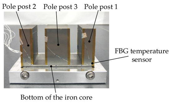 During the experiment, a total of 7 FBG temperature sensors were arranged in the iron core, including 17 FBG temperature sensors. For the convenience of narration, the pole posts on both sides of the E-type electromagnet are marked as pole post 1 and pole post 3, the pole post in the middle is marked as pole post 2, and the part with the FBG sensor at the bottom is marked as the bottom of the iron core (shown in Figure 17). Figure 18a–d are the variation curves of temperature measured by 7 FBG temperature sensors in the iron core with current.