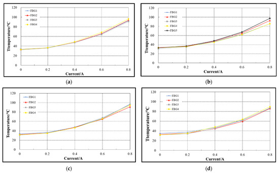 It can be seen from Figure 18d that the temperature variation trend of the four FBG temperature sensors on the bottom of the iron core with current is consistent, and the temperature variation curve with current is almost coincident. Compared with the variation curve of FBG temperature with the current in Figure 18a–c. Under the same current, the temperature value measured by each FBG at the bottom of the iron core is slightly less than that measured by each FBG on the pole column of the iron core. The analysis shows that due to the existence of coil winding on the pole column of the iron core, the heat of the coil winding transfers the heat to the iron core through heat conduction. Therefore, the iron core with the FBG sensor at the bottom of the iron core is directly exposed to the air. The three pole columns of the iron core are wrapped by the coil winding. Therefore, the heat dissipation at the bottom of the iron core is better than that of the three pole columns of the iron core, and the temperature at the bottom of the iron core is slightly lower than that of the three pole columns of the iron core.
