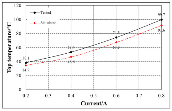 Comparison of experimental and simulated values under different currents (maximum temperature).