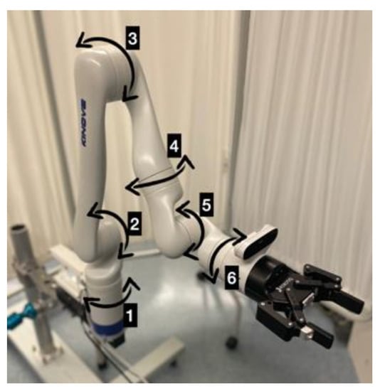 Figure 1. The robot with joints labelled (1–6) and arrows showing rotation for each of the six joints.