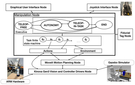 • The manipulation node contains the main system state-machine, referred to as the system executor. When the VGS control is started, the system executor runs continuously for the system’s lifetime. This node contains a configuration file written in the YAML data-serialization markup language, for defining object properties including shape, size, and position relative to the ArUco tag. The node also supports the system state transitions between autonomous and user-teleoperation actions. The system executor calls various actions for each subtask that are pre-defined in an action library. For autonomous actions, once the user selects an object for interaction, the manipulation node parses the shape and size of the environment obstacles based on the ArUco tag ID. Obstacles are then added to the environment-planning scene for the robot path planning. The VGS automatically moves the robotic arm, through software, to a 6-DoF goal pose in the environment that is either achieved through motion planning or through a direct call to the Kinova Kortex driver. In both software calls, the third-party libraries (MoveIt ROS package or Kortex ROS driver package) both perform an inverse kinematic calculation utilizing their own internal kinematic solvers. A MoveIt motion-planning framework [23,24] is used to generate obstacle-free paths. The path is first generated by solving for an inverse kinematic solution using the Trac IK kinematic plugin. If a solution is not found, the planning then tries to generate a feasible path using the sample-based RRTConnect planner [25]. If all planners fail to find a solution, the robot goes back to the home position, re-plans or aborts the autonomous action, and prompts the user to teleoperate the robot. Successful paths are then executed through calls to the Kinova Gen 3 controller, which moves the arm to specific path positions. Actions that do not require motion planning, such as opening the gripper and pulling to open the cabinet, directly call the Kortex driver. As different parts of the task share common actions (e.g., reaching for an object), the executor chooses an action to call (sometimes repeated) based on a state machine that describes the current subtask.