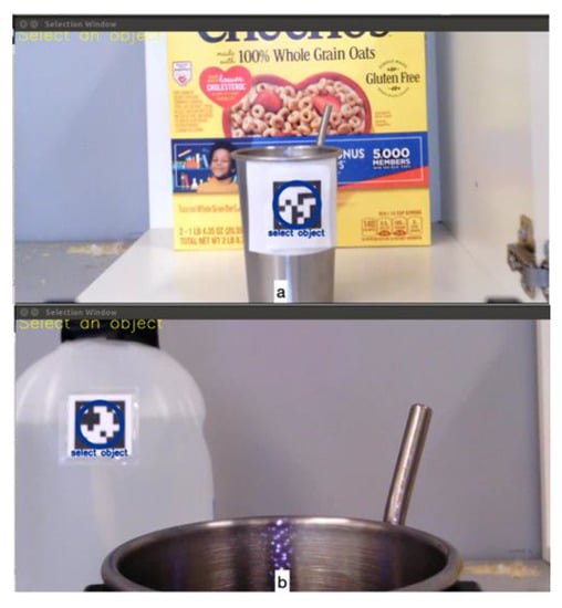 • Autonomous robot operation is initiated through the fiducial tag node. Fiducial tags offer highly distinguishable patterns with strong visual characteristics, and are often used for the identification, detection, and localization of different objects. We chose ArUco tags in this study given their great detection rate, good position and orientation estimation, and low computational cost [20]. The fiducial tag node wraps an open source ArUco library [21,22] into the ROS architecture for publishing the number, position, and orientation of each ArUco tag fixed to a target object with respect to the robot’s wrist-mounted camera. The information is published to the manipulation node and used to display a tag selection area on the graphical user interface (GUI), and to model obstacles in the environment.